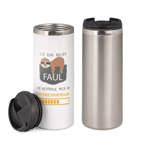 Den sylindriske formen i hvitt eller sølv gir resultater av spesielt høy kvalitet med sublimeringstrykk takket være Sublistar®-overflaten. Lokket er ergonomisk formet og har en lukkbar drikkeåpning.